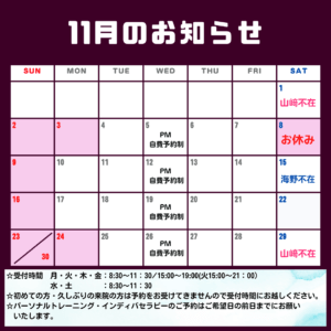 祝日11/3(月)、24(月)はお休みとなりますのでお間違えないようご注意ください。