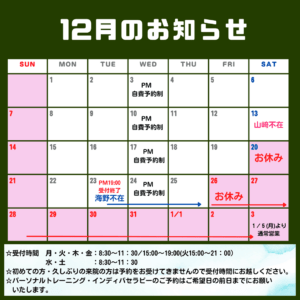 今年は月末に院外のお仕事があるため例年より早く年内の営業を終えさせていただきます。